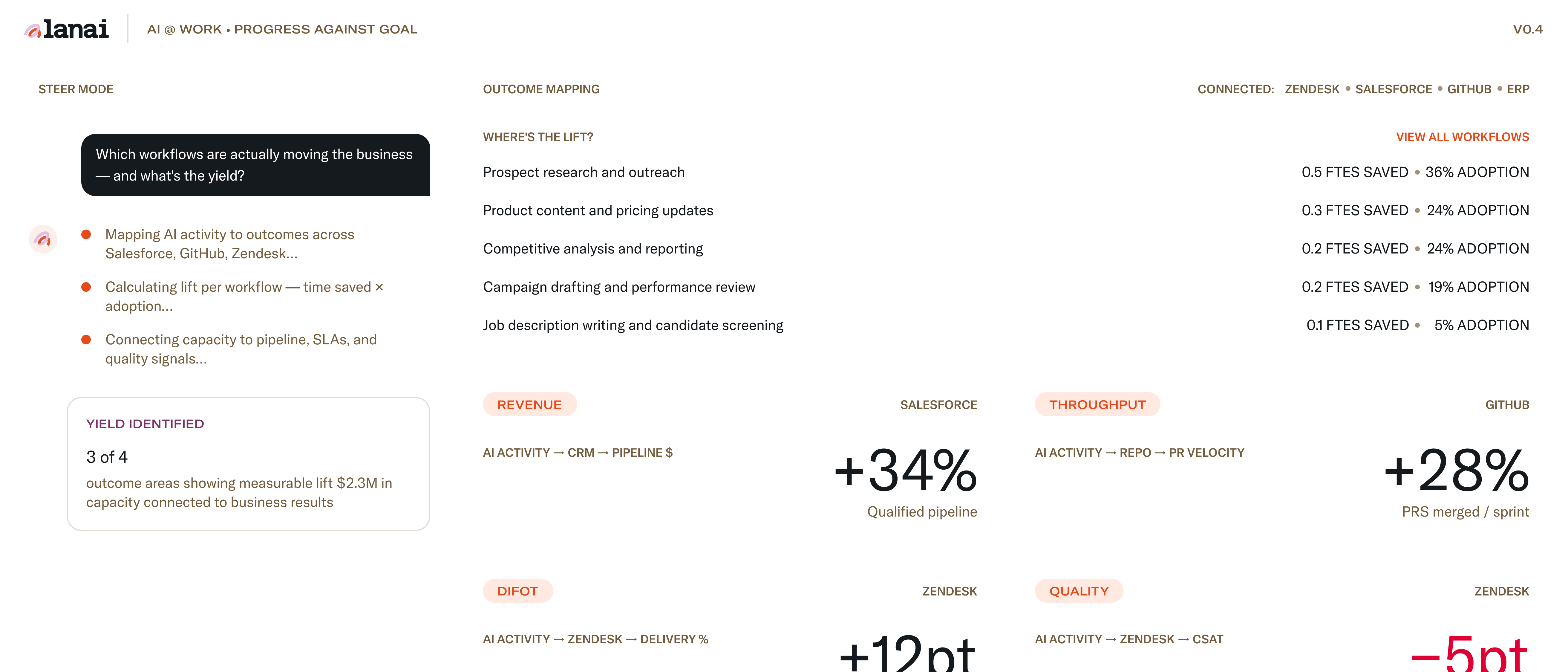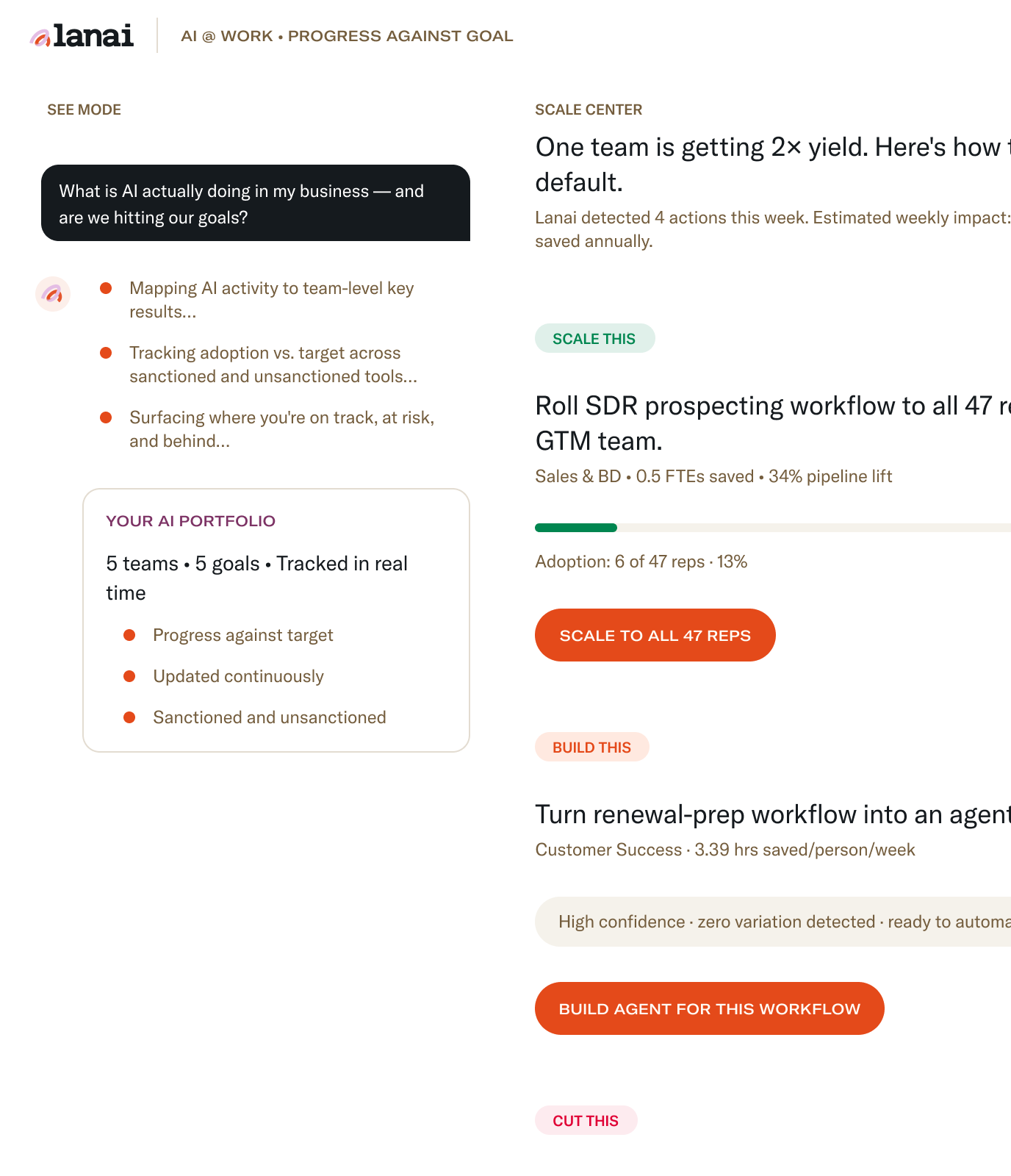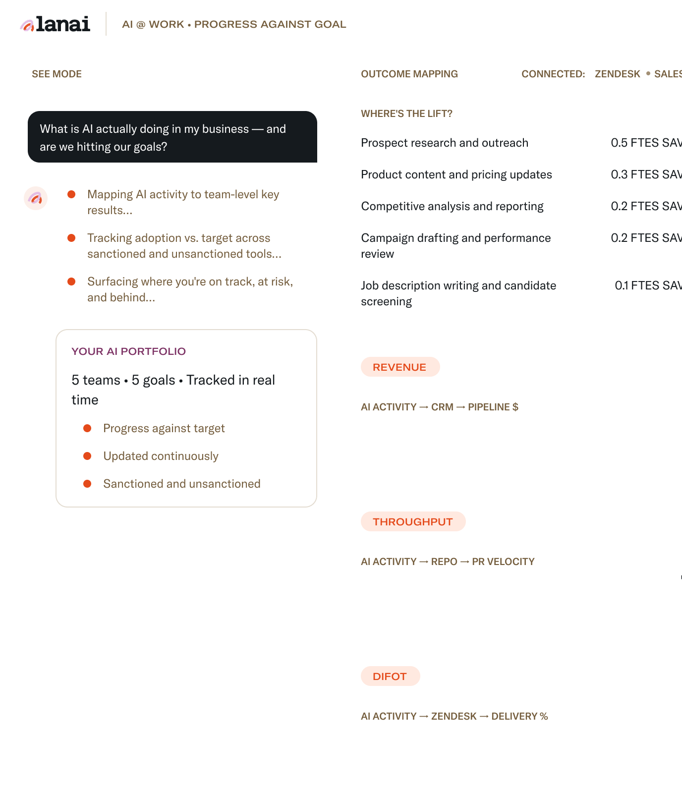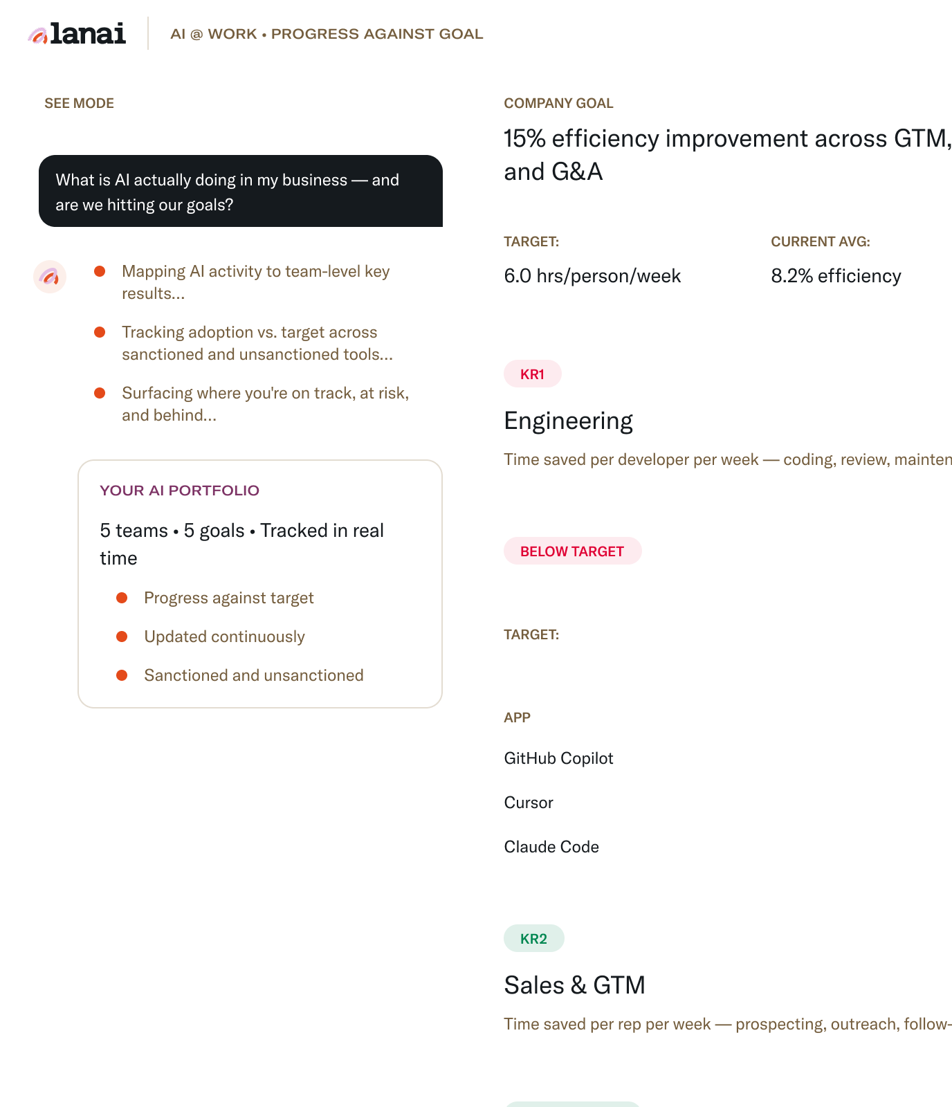 Every team. Every key result. Every AI investment tracked against the target you committed to — across sanctioned and unsanctioned tools, updated in real time.